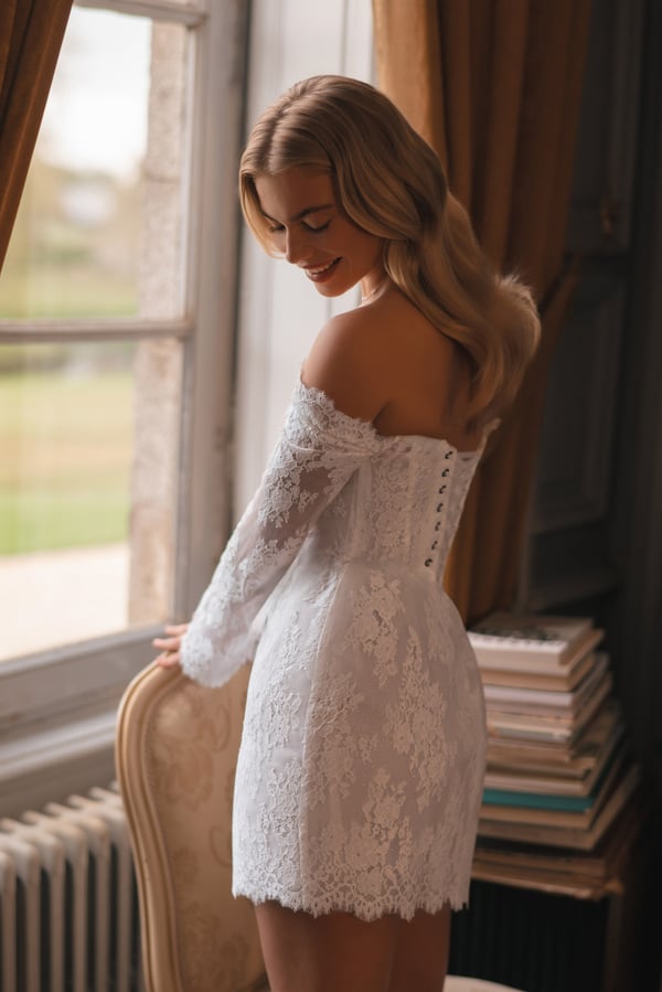 A lace long skirt with a train is ideal for the ceremony; a long satin skirt with diagonal draping and a slit down the leg, for the banquet; and a lace mini-dress, for the dance part of the evening.