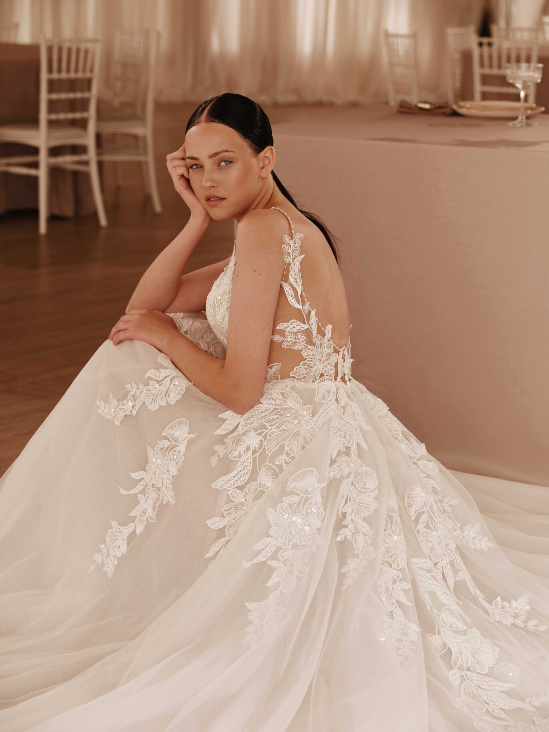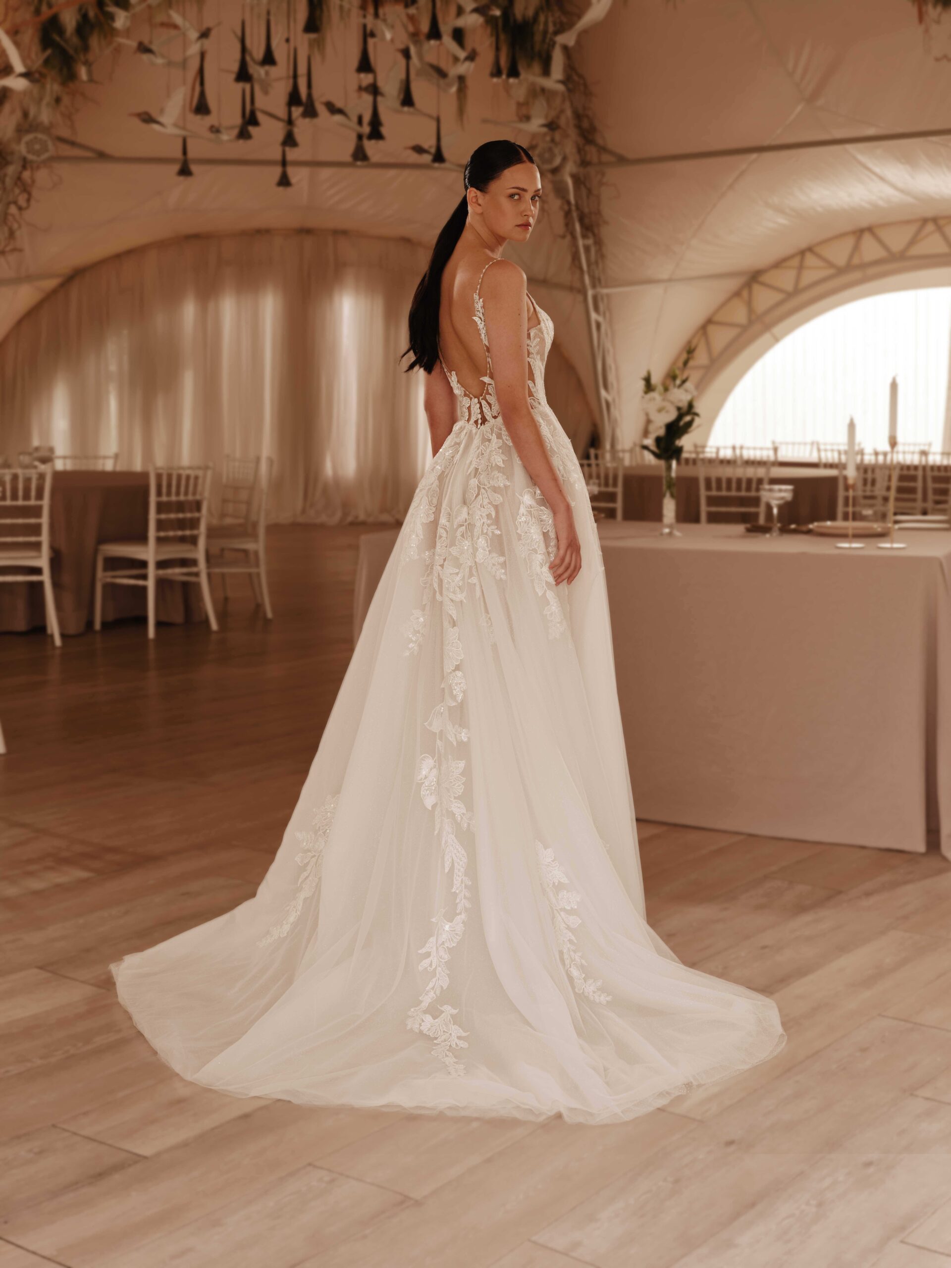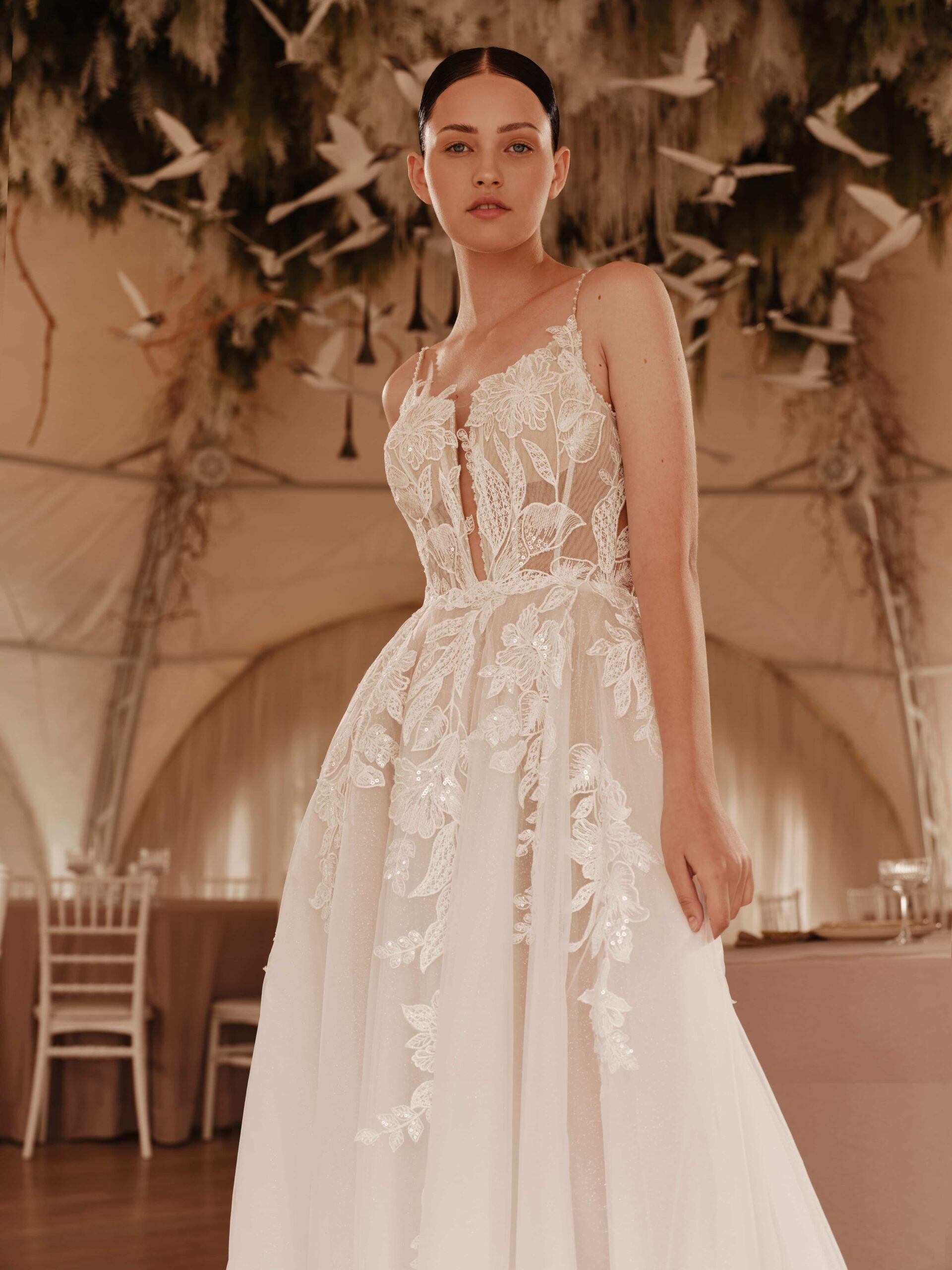 - This light A-line dress captivates with its elegance, featuring a V-shaped neckline on the corset that accentuates the décolletage.